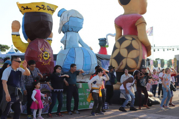 ▲ 축제 콘셉트에 맞는 조형물, 게릴라 공연으로 축제장 들썩∼ 축제장 곳곳에 설치 된 크고 작은 조형물과 함께 축제장 곳곳에서 진행되는 ‘뚝블리’들의 게릴라 공연이 축제장 분위기를 들뜨게 했다. 메인 무대인 경연무대는 높이 10m, 넓이 20m의 대형 말뚝이 탈이 팔을 벌려 인간의 소원을 들어주는 형상으로 무대 백드롭을 장식했고, 마당무대는 젊은 층을 고려해 대학로와 같은 무대 백드롭으로 공연자와 관람객이 함께 호흡하도록 했다. 경연무대와 주공연장을 잇는 통로는 엄마까투리를 비롯한 다양한 조형물로 채워 인증샷 공간으로 제공했다. 318개에 이르는 부스에는 간판 형태의 상가 외벽을 설치해 축제 디자인 변화를 줬다.