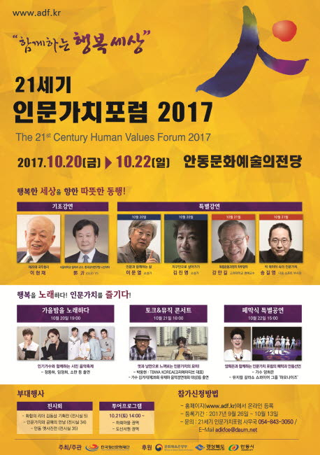 오는 10월20일 안동문화예술의 전당에서 인문가치의 생활화·산업화·세계화를 선도하는 <21세기 인문가치포럼2017> 개최되며 전시·공연 등 다채로운 인문가치 참여프로그램을 비롯하여 각 국을 대표하는 인문학분야의 전문가들이 참가하는 학술 및 실천프로그램이 전개된다.