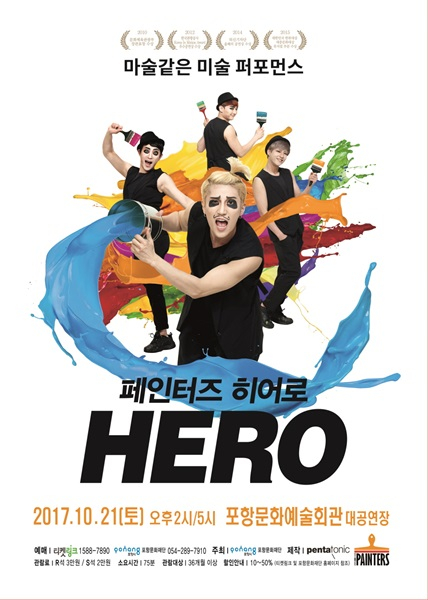 |  | | | ⓒ GBN 경북방송 | | 공연의 주제는‘영웅’으로 마이클 잭슨, 이소룡 등 세계 각국의 영웅들이 각기 다른 10가지 미술기법(액션페인팅, 스크래치, 마블링, 스탠실, 크로키 드로잉 등)을 통해 무대에서 재탄생한다. 특히 일월문화제 기간에 맞춰 선보이는 만큼 포항의 대표적 설화인 연오랑세오녀도 멋진 작품으로 탄생할 예정이다. 75분이라는 공연 시간이 짧게 느껴질 만큼 기발한 반전을 쉴 새 없이 거듭하며 재미와 감동을 전해줄 것이다. |  | | | ⓒ GBN 경북방송 | | 이번에 포항을 찾는‘페인터즈 히어로’는 국내뿐만 아니라 일본, 미국, 중국, 홍콩, 싱가포르, 말레이시아, 태국, 인도네시아, 프랑스 등 17개국 103개 도시에서 공연하며 전 세계 관객들과 만나고 있다. 세계 각국으로부터 재미와 감동 그리고 창의적인 아이디어로 가득 찬 공연이라는 찬사로 K-퍼포먼스의 위상을 널리 알리고 있다. 해외 관객 상승률의 공로를 인정받아 2010년 넌버벌 퍼포먼스 관객상승률 1위의 수상을 거머쥐는 영예를 안았고, 그 해 12월 문화체육관광부 장관 표창을 받는 등 한국대표 공연으로 자리매김했다.