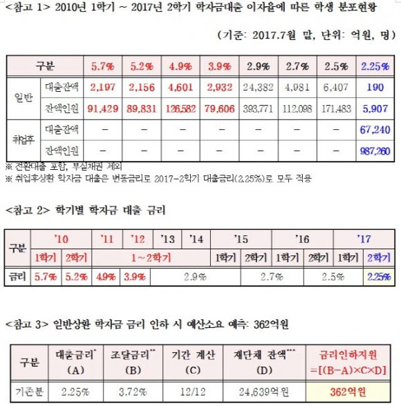 한편, 형평성에 기인해 2010년 1학기부터 2017년 1학기까지 일반상환대출 금리를 2.25%로 일괄인하 시, 2018년부터 연간 약 362억원의 예산소요가 있을 것이라는 분석이 나와 이 부분 예산확보가 무엇보다 중요하다는 것이 김 의원의 평가다.