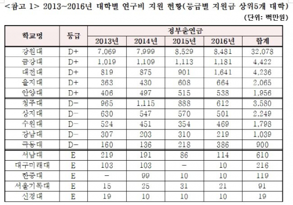 D+ 등급(일부해제)의 26개교, D- 등급(일부제한) 24개교, E등급(전면제한) 13개교에 지난 2013년 147억원 규모였던 연구비 지원이, 1주기 대학구조개혁평가가 있었던 2015년에 약 164억원, 후속년도였던 2016년엔 약 168억원 이상 지원되면서 증가 추세를 보였다. ※ D+ 등급(일부해제): 신규 사업지원의 제한 D- 등급(일부제한): 기존·신규 사업지원에 모두 제한 받고, 국가장학금 Ⅱ유형 및 학자금 대출 50% 제한 E등급(전면제한): 모든 사업지원에 제한 받고, 국가장학금 Ⅰ, Ⅱ 유형 및 학자금 대출 100% 제한