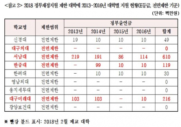 아울러 지난 9월 초에 발표된 ‘대학구조개혁 후속 2차년도 이행점검’ 결과 2018년 2월 폐교가 결정된 서남대, 대구미래대, 한중대 등 ‘2018정부재정지원 제한’ 25개 대학에 대해서도 지난 2년간 61억원을 지원해 각종 경영비리 및 부실운영 등으로 폐교가 확정된 대학들에게도 연구비를 지원한 것으로 밝혀졌다.