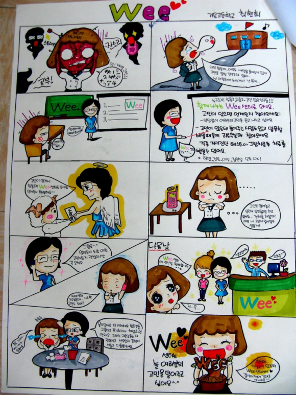 □ 「함께 나누는 Wee센터로 오세요」라는 작품으로 대상을 수상한 가은고 2학년 최현희 학생은 상담의 진행과정을 재치있게 그려냄으로써 문경Wee센터의 주된 역할을 잘 표현하며 문경Wee센터 홍보를 위한 독창적인 캐릭터를 구현해 내었다. 대상 작품의 만화캐릭터는 앞으로 문경 Wee센터만의 각종 홍보물 및 홍보 캐릭터로 활용되어질 계획이다.