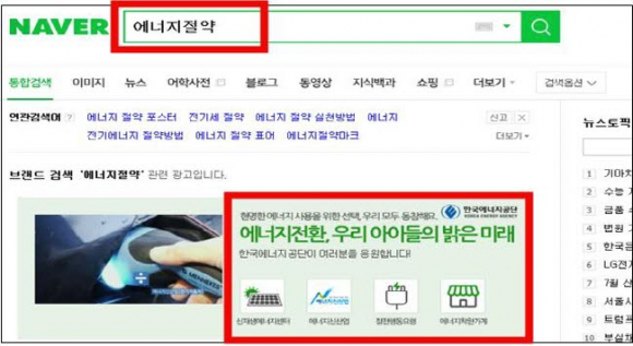 지정한 검색어 15개를 인터넷 포털사이트 검색창에 입력하면 “에너지 전환, 우리아이들의 밝은 미래”라는 문구와 함께 신재생에너지센터, 에너지신산업 정보로 연결 가능하게 만들었다.