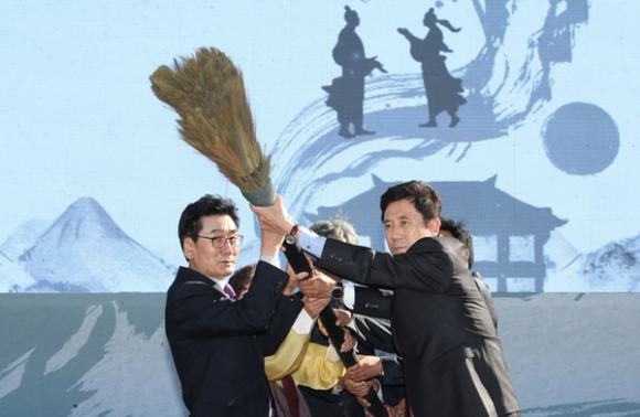 |  | | | ⓒ GBN 경북방송 | | 같은 날, 문화예술회관 앞마당 특설무대에서는 개막식이 펼쳐졌다. 이강덕 포항시장과 문명호 시의회 의장, 국립경주박물관 유병하 관장을 비롯해 올해 선발된 제19대 연오랑세오녀 부부 등이 참여한 가운데 우리지역의 전통문화에 현재를 알 수 5개 분야의 전통문화 이수자의 식전공연과 취타대 개식통고로 막을 열었다. 대형 붓과 미디어 아트를 활용한 ‘화룡점정’ 퍼포먼스가 펼쳐졌으며, ‘Story of Atomic number 26, Fe’의 주제공연과 스틸난타 공연이 더해졌다.