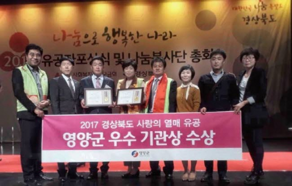 영양군(군수 권영택)은 지난 25일 영천시 시민회관에서 개최된 「2017 경북 사랑의 열매 유공자 포상식 및 나눔봉사단 총회」에서 우수 기관상을 수상하는 영예를 안았다. 이번 시상은 도내 23개 시‧군을 대상으로 지난해 이웃돕기 성금 모금 추진과 나눔활동 및 성과를 평가해 우수 지자체 및 우수 나눔 봉사단을 선정하여 주는 상이다.