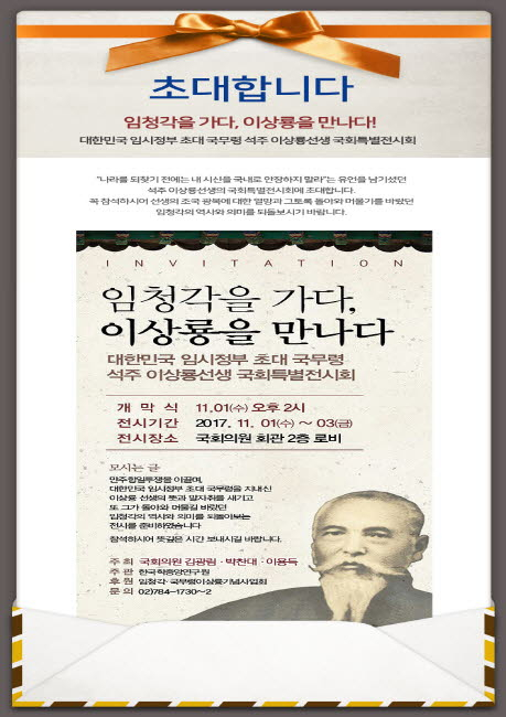 대한민국 임시정부 초대 국무령이자 독립운동가인 석주 이상룡 선생 특별전 ‘임청각을 가다, 이상룡을 만나다’가 오는 11월 1일 오후 2시 국회의원회관 2층 로비에서 개막식을 열고 3일까지 전시된다.