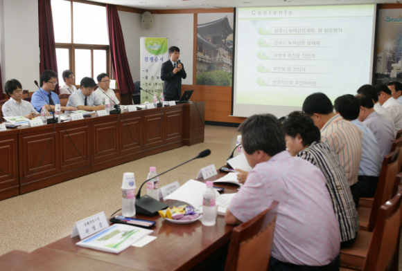 경주시는 26일 시청영상회의실에서 이태현 부시장을 비롯하여 위덕대학교 이창수 교수외 3명의 자문위원 교수와 각 실과소장 등이 참석한 가운데 “경주시 녹색성장 추진계획” 수립을 위한 연구용역 중간보고회를 개최 하였다.