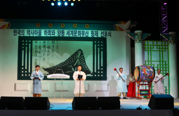경주시는 28일 강동면 양동초등학교 운동장에서 프랑스 파리에 있는 유네스코 본부로부터 공식적으로 양동마을이 세계유산으로 지정되었음을 통보받아 1천명의 시민과, 문화예술인들이 참석한 가운데 세계문화유산 등재 선포식을 개최했다.