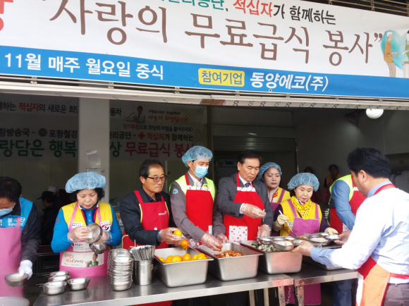 ‘홀몸어르신 행복밥상 나눔’ 포항시의 지원과 철강관리공단의 후원 등으로 적십자에서 운영하는 무료배식 행사로, 매주 월요일 관내 어르신들에게 따뜻한 점심식사를 제공하고 있다.