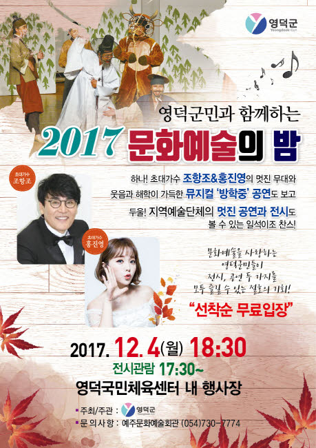 오는 12월 4일(월) 저녁 5시 30분부터 영덕군 예주문화예술회관에서 2017년 정유년 한해를 마무리하는「영덕군민과 함께하는 2017 문화예술의 밤」행사가 열린다.