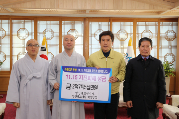 이날 성금전달을 위해 영산불교대학 학장 일도스님과 교학차장 범행스님 등 영산불교대학 관계자들이 직접 포항시청을 방문했다. 일도스님은 이강덕 포항시장에게 학생들이 십시일반 모은 성금을 전달하며 “이 성금이 지진으로 어려움을 겪고 있는 포항시민들에게 조금이나마 도움과 위안이 되길 바란다”고 위로의 말을 전했다.