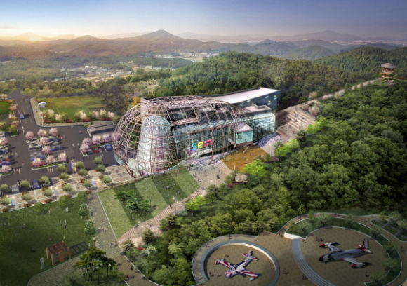 특히 건물 입면을 우주형성 빅뱅론의 근원이 되는 우주알(COSMIC-EGG)의 원시 형태를 형상화하고 주변 연호지와 조화롭게 연계하여 전망대, 연호쉼터, 항공기 야외 전시장까지 마련함으로써 군민들에게 편안한 휴식 공간을 제공하고 있다.