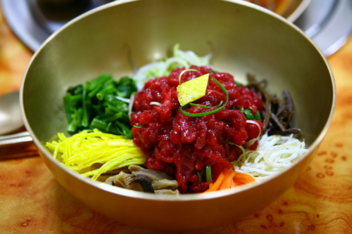 요리방법 1. 각종 나물(천년한우, 건천 표고버섯, 암곡 동대봉산 미나리, 산내 단고사리등)을 준비한다. 2. 한우를 채 썬다. 3. 육회 소스에 고기를 버무린다. 4. 그릇에 각종 나물을 담고 중앙에 육회를 올린다.