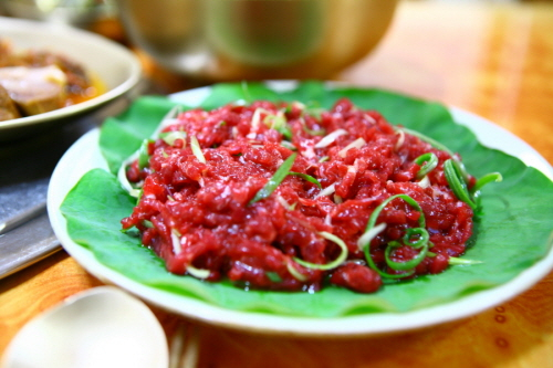 고기는 한우 우둔살 사용한다.. 육회소스 – 한약재료와 과일등 15가지 정도를 넣고 만든 소스 사용 고기는 하루 이상 숙성시킨 쇠고기를 슬라이스해 자른다. 고기 장만 시 힘줄을 제거해야 부드러운 고기가 나오고 15가지 양념소스를 붓고 국산 참기름으로 버무려 만든다.