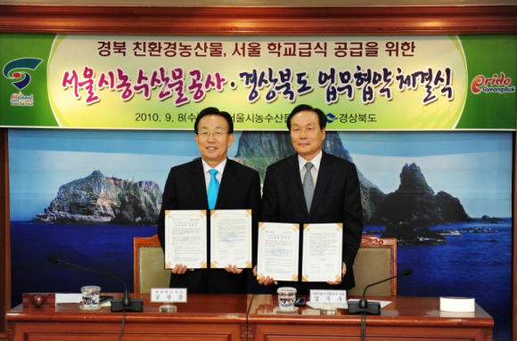 경상북도는 9월 8일 오전 11시 도청 회의실에서 김관용 도지사와 김주수 서울시농수산물공사 사장간 ‘경북 친환경농산물 서울시 학교급식 식자재 공급을 위한 상호협력 업무협약(MOU)’을 체결했다.