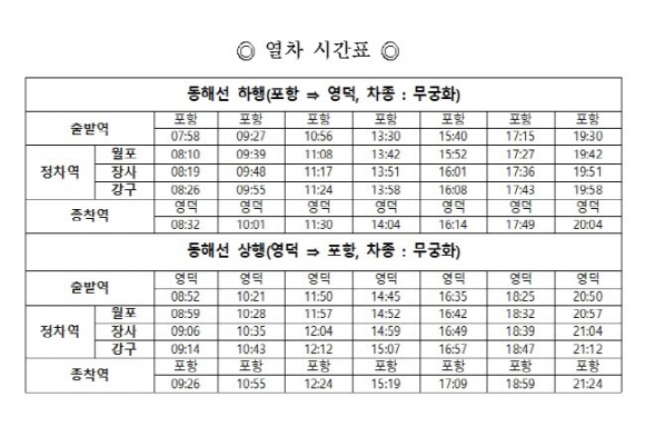 열차는 상행방면(영덕→포항) 일 7회, 하행방면(포항→영덕) 일 7회 운행할 계획이다. 포항발 첫 열차는 오전 7시 58분에, 마지막 열차는 오후 7시 30에 출발하고 영덕발 첫 열차는 오전 8시 52분, 마지막 열차는 오후 8시 50분에 출발할 예정이다. 34분이 소요되며, 월포역, 장사역, 강구역에 정차한다.