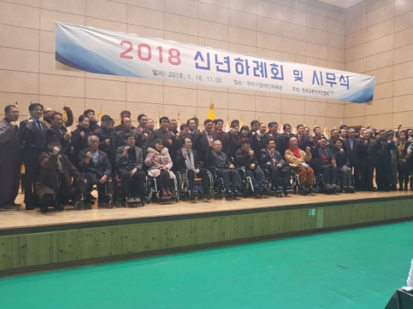 경상북도는 16일(화) 구미시 장애인체육관에서 한국교통장애인협회(중앙회장 김락환) 주관으로 17개시도 협회장, 임직원, 시군 지회장 등 300여명이 참석한 가운데 무술년 새해를 맞아 신년하례회 및 시무식을 가졌다고 밝혔다.