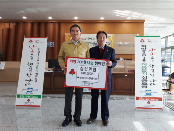대한노인회 상주시지회(지회장 배춘병)와 문경시지회(지회장 박호준)가 지난 15일 지진피해로 어려움을 겪고 있는 포항시 시민들을 위한 이웃돕기 성금으로 각 130만원, 70만원을 전달했다. 이날 전달은 대한노인회 포항시지회장(황보 기)이 대신 방문해 두 지회의 따뜻한 마음을 전달했다. |