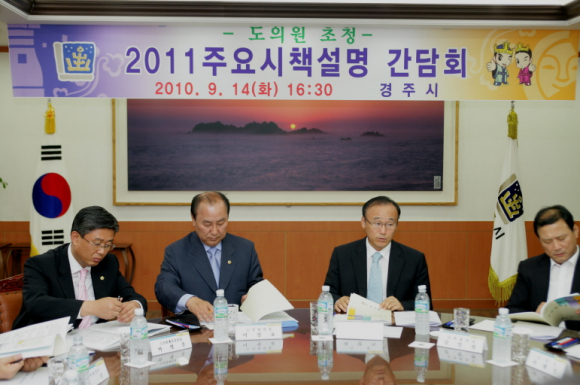 |  | | | ⓒ GBN 경북방송 | | 이날 간담회에는 이상효 도의회의장, 박병훈 예산결산특별위원장, 이달, 최학철, 최우섭 도의원을 비롯해 최양식 경주시장, 국.소장 등 17명이 참석한 가운데 기획예산담당관의 2011년 주요 도비 보조사업 및 당면 현안사업 설명 후 토론을 가졌다.
