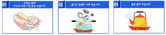 따라서 노로바이러스감염증 예방과 확산방지를 위해서는 손씻기, 음식 익혀먹기, 물 끓여 마시기 등 개인위생수칙을 준수하고 발생 후에는 염소계 소독제를 이용하여 환자가 사용한 물품과 장소 등 환경소독을 하는 예방수칙준수해야 한다. |