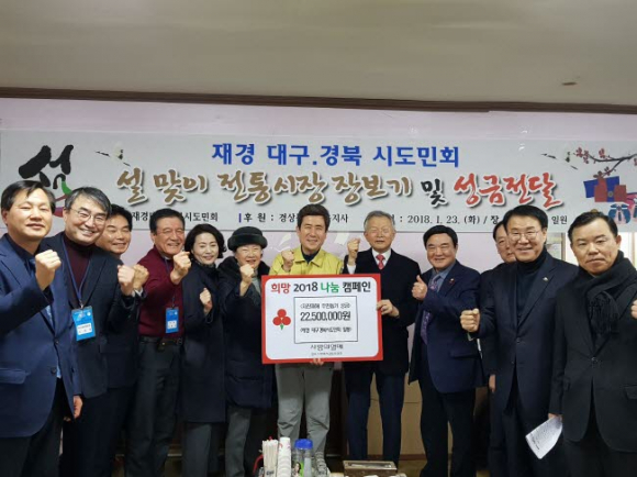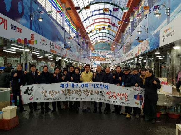 재경대구‧경북시도민회(회장 류목기)는 23일(화) 재경출향인 단체 회원 160여명과 함께 포항시 죽도시장을 찾아 지역 전통시장의 소비 활성화를 위한 장보기 행사를 갖고 지진으로 어려움을 겪고 있는 피해 주민을 위한 성금 모금액 2,250만원을 이강덕 포항시장에게 전달했다.