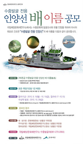 문화재청 국립해양문화재연구소(소장 성낙준)는 아시아 최초로 건조되는 수중발굴 전용 인양선의 배 이름을 모든 국민을 대상으로 공모한다.