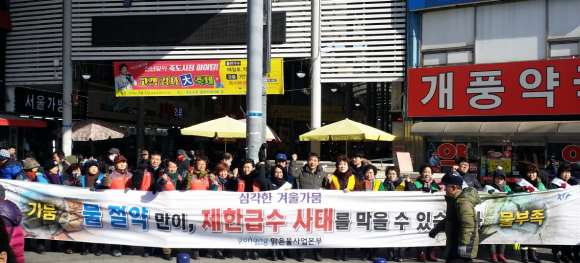 포항시가 극심한 겨울가뭄 극복을 위해 29일 죽도시장에서 물절약 캠페인을 실시했다.