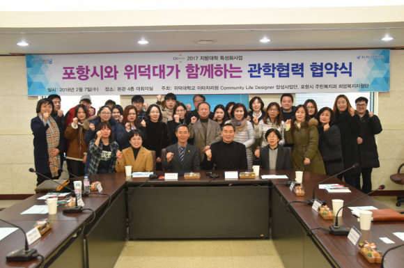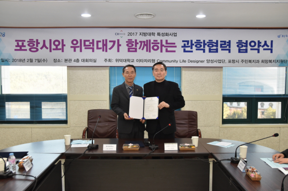 포항시 희망복지지원단은 지난 7일 위덕대학교 본관 회의실에서 홍욱헌 위덕대 총장과 정연대 포항시 복지국장이 참석한 가운데 관․학협력 협약식을 체결했다.