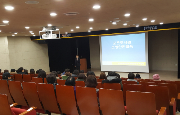 포은중앙도서관은 8일 1층 어울마루에서 포항북부소방서 예방안전과 주관으로 도서관이용자, 자원봉사자,직원들을 대상으로 소화기 사용방법, 화재발생시 대처요령 등 소방안전교육과 심정지자 발생시 심폐소생술 방법 등 안전교육을 실시했다. |