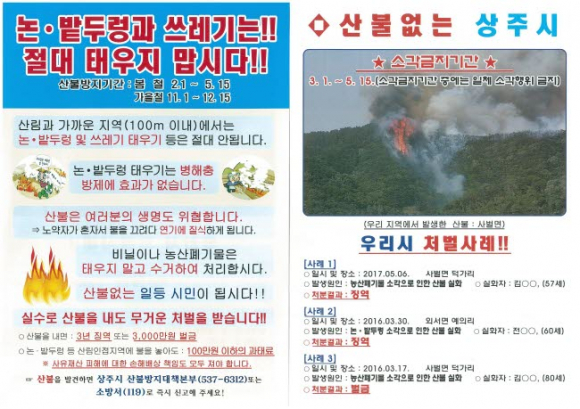 상주시(시장 이정백)는 산불의 원인을 차단하기 위해 ‘산불 없는 상주시’ 전단을 제작해 배포하는 등 홍보에 발 벗고 나섰다.