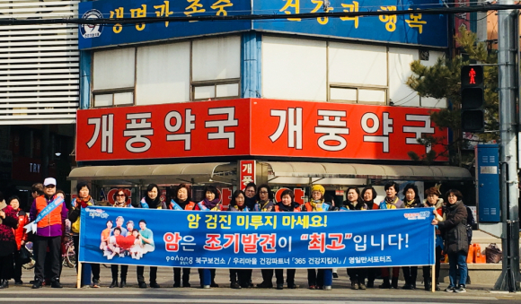 포항시 북구보건소는 19일 죽도시장 일대에서 365건강지킴이 자원봉사단 20여명과 함께 국가암 조기 검진 대시민 홍보 캠페인을 펼쳤다.