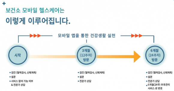 “모바일 헬스케어 사업” 은 보건소를 방문하지 않고도 스마트폰 앱 등으로 언제 어디서나 맞춤형 건강관리를 받을 수 있는 사업으로 건강검진 결과 혈압, 공복혈당, 중성지방, 콜레스테롤, 허리둘레 중 건강위험요인을 하나 이상 갖고 있는 잠재적 만성질환자들의 체계적인 건강관리가 가능해진다.