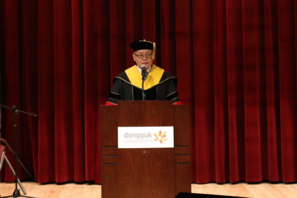 전영화 동국대학교 총동창회장은 “여러분은 동국에서 배우고 익힌 학문과 지식을 우리 사회에서 더욱 빛내기 위한 새로운 출발선에 섰다”며 “개교 112주년의 전통과 30만 동문을 가진 명문 동국 출신이라는 자부심을 가져주길 바란다”고 당부했다.