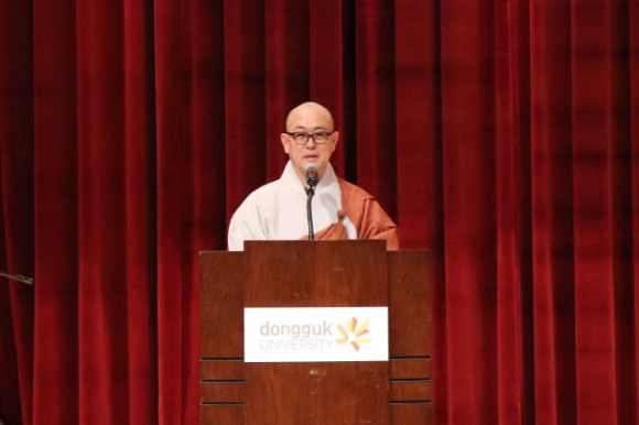학교법인 동국대학교 이사장 자광 큰스님은 학교법인 동국대학교 사무처장 성효스님이 대독한 치사에서 “여러분은 동국대에서 부처님의 가르침인 인연 법칙을 배웠다”며 “인연의 소중함을 알고 모든 사람과 좋은 인연을 맺어 사회에 나가서도 동국의 향기가 사회 곳곳에 퍼질 수 있도록 해달라 ”고 격려했다.